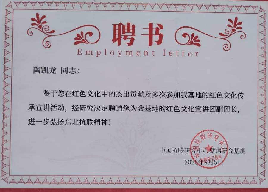 在当天举行的聘任仪式上,中国抗联研究中心盘锦研究基地主任、东北抗联后代侯振江郑重地将聘书颁发到陶凯龙手中并勉励在宣传弘扬东北抗联的忠诚于党的坚定信念(东北抗联精神的政治灵魂)、勇赴国难的民族大义(东北抗联精神的使命担当)、血战到底的顽强斗志(东北抗联精神的奋斗内核)多做贡献,为建设强大的祖国贡献力量。